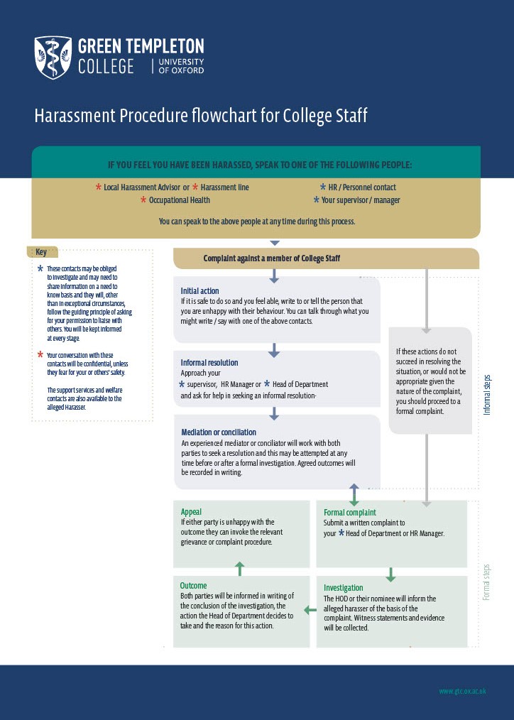 8. If informal action does not succeed in resolving the situation, or would not be appropriate given the nature of the complaint, the complainant should make a written complaint. If the complainant is a member of staff, the complaint should be submitted to the HR Manager. If the complainant is a student, the complaint should be submitted to the Dean of Welfare who will then communicate it to the HR Manager or their line manager. A student complainant may also seek support as relevant from the Director of Student Welfare and Support Services. In cases where it is not immediately clear to whom a complaint should be addressed, or if the complainant feels it is not appropriate to approach the HR Manager, or wishes to make a complaint against the HR Manager, advice may be sought from Harassment Advisors / the Dean of Welfare. Students and staff can seek support from College Harassment Advisors throughout the complaints process. If the student or staff member does not feel comfortable contacting a College Harassment Advisor, they can contact the Harassment Line for details of another advisor (Tel. 01865 270760 or email harassment.line@admin.ox.ac.uk).